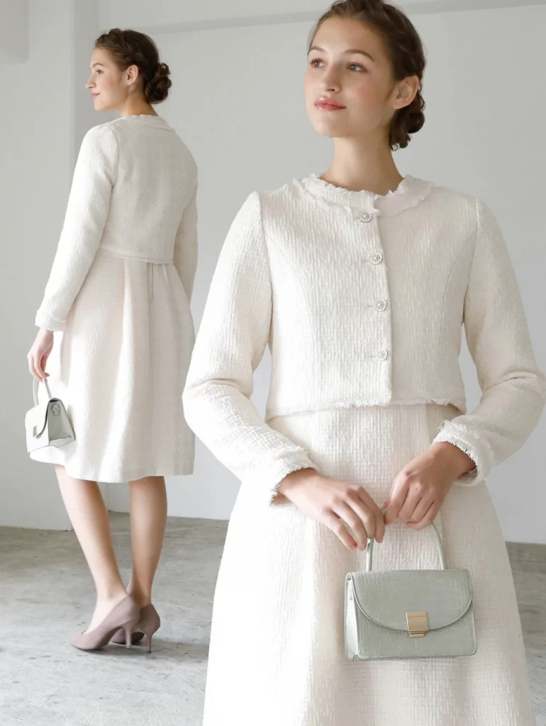 お祝いの日にぴったりのホワイトツイードは、写真映えも抜群のカラーです。