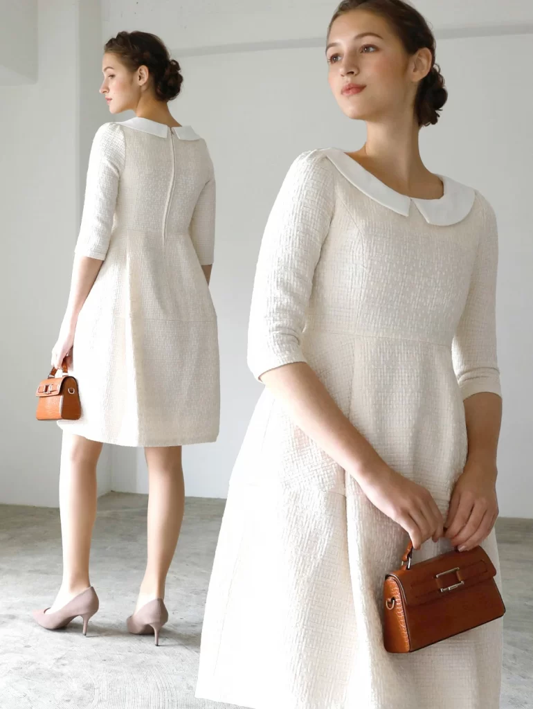 襟付きワンピースは、単色のツイードワンピースに華やかさと個性をプラスしてくれます。また入園式では欠かせない、コサージュやブローチが映えるデザインです。