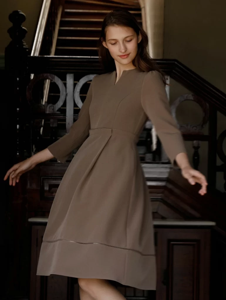 落ち着いたカラーのワンピースを選ぶことで、上品エレガントなスタイルが完成します。