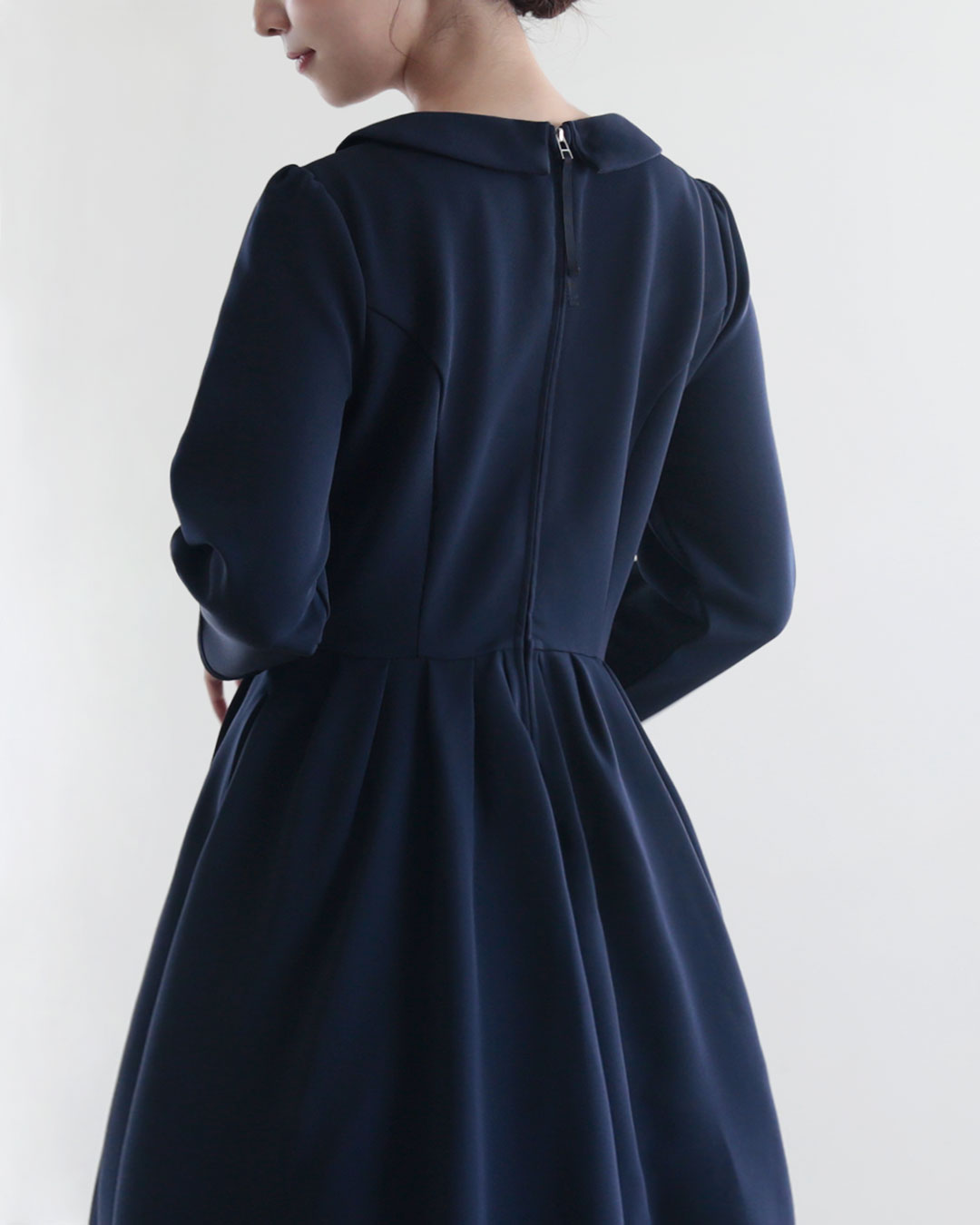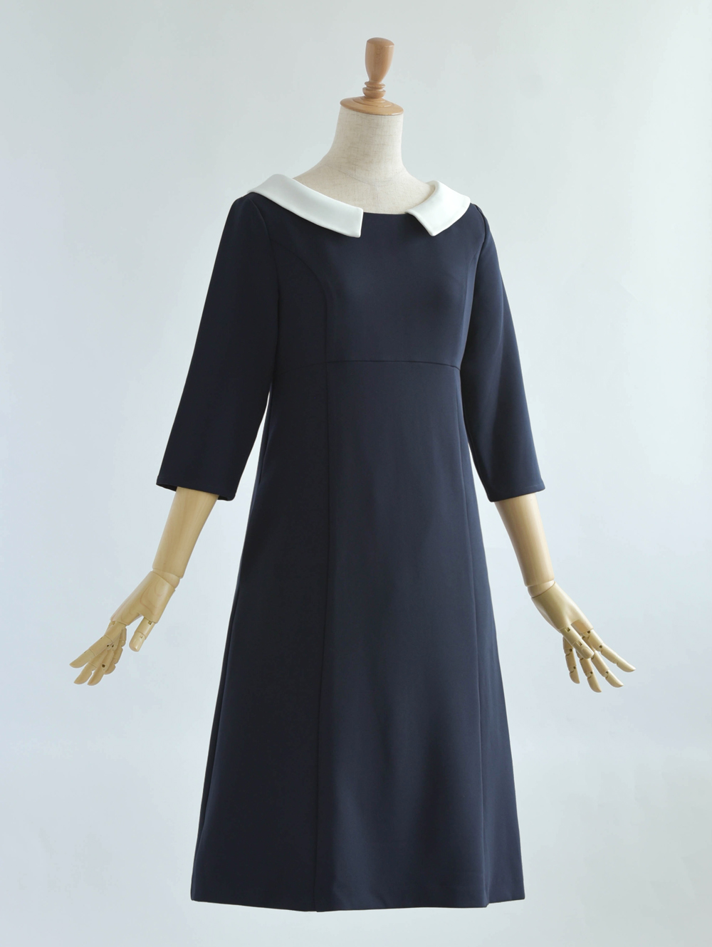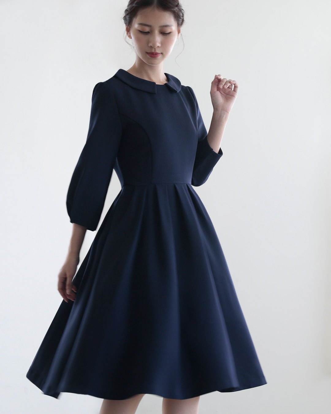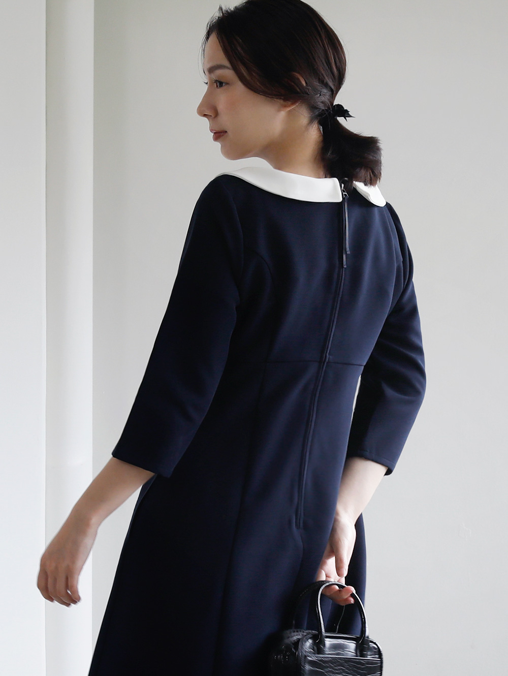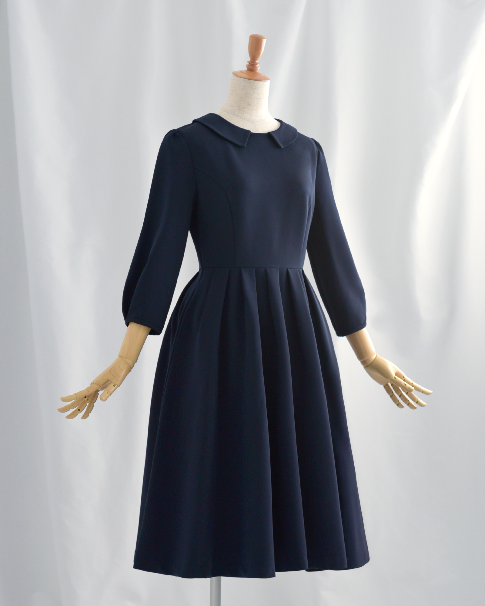 深みのあるネイビーと、計算されたフィット&フレアのシルエットが、上品さと清潔感を漂わせます。