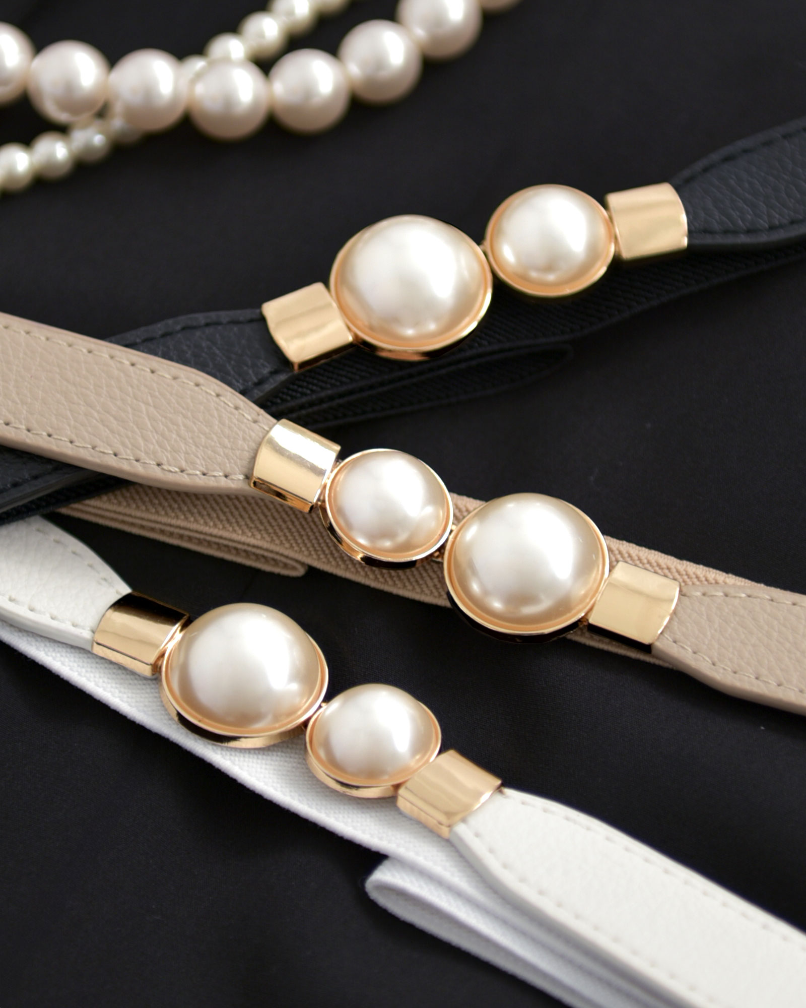 ウエストをさりげなく引き締めてくれる【エレガント パール ベルト】を合わせれば、シンプルなワンピースも一気に格上げされ、洗練された雰囲気に。