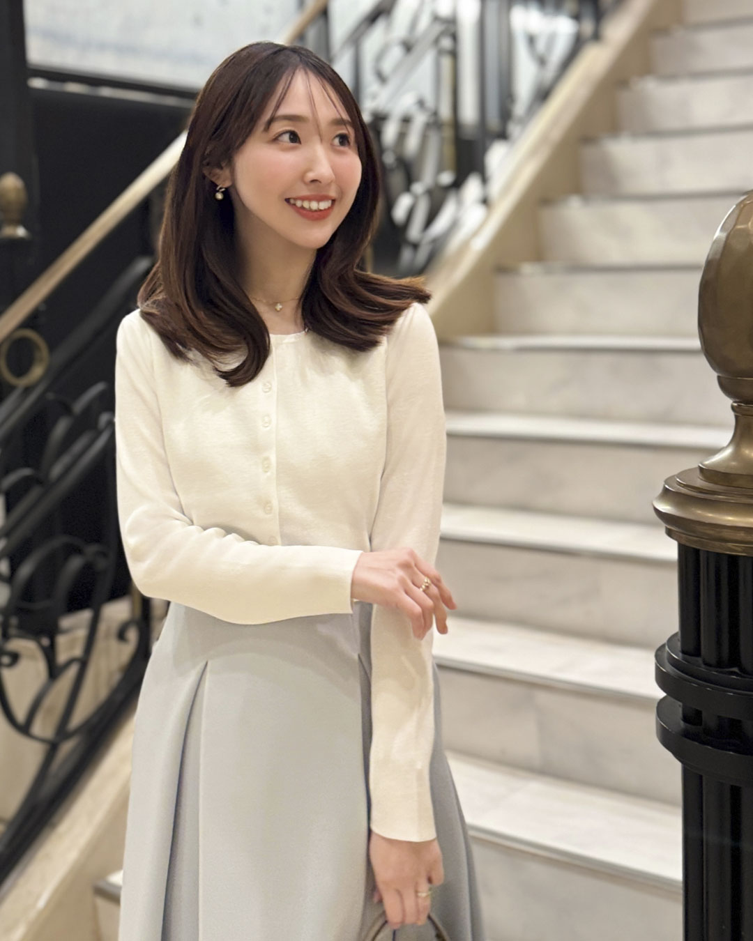 ワンピースの上にカーディガンを羽織るだけで、コーデに奥行きが生まれ、上品さがぐっと増します。