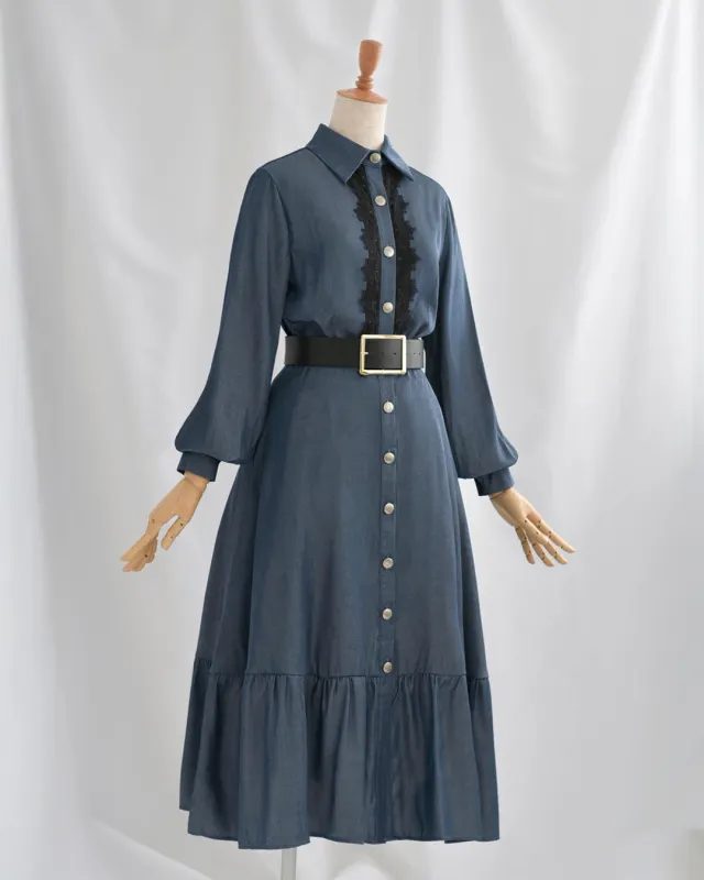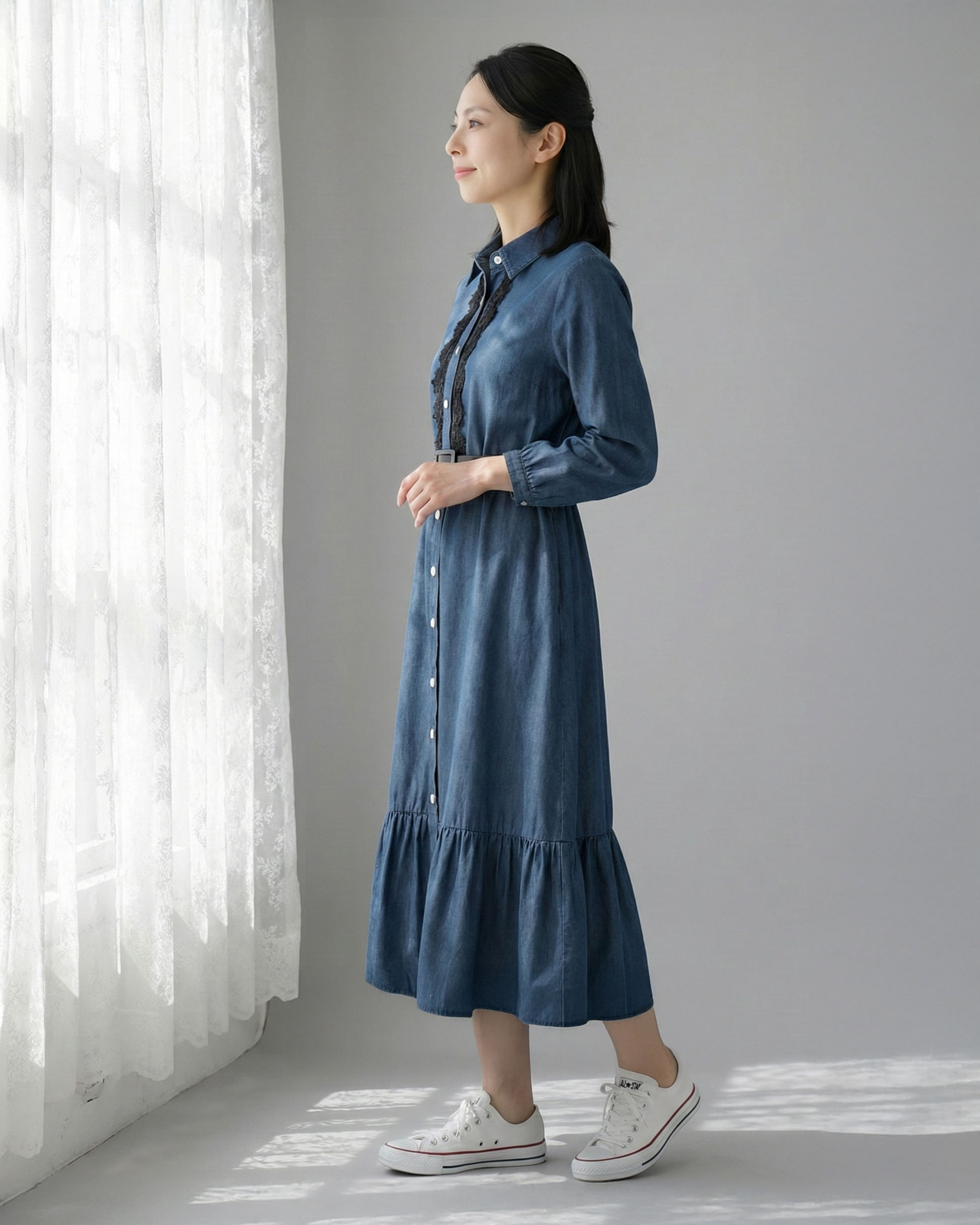 上品なデニム調生地と前立てレースのコントラストが、スニーカーの軽さと絶妙に合います。