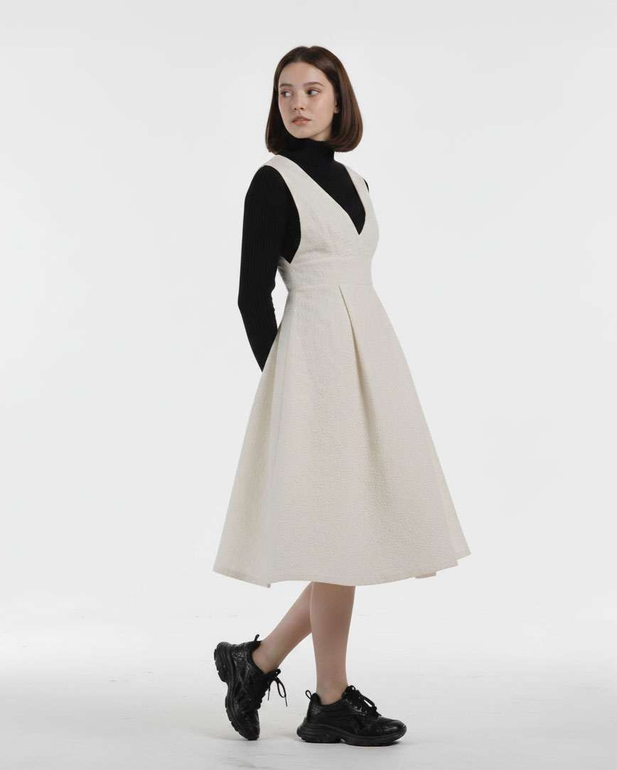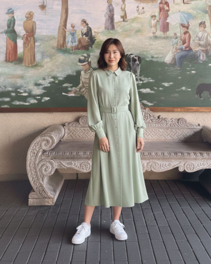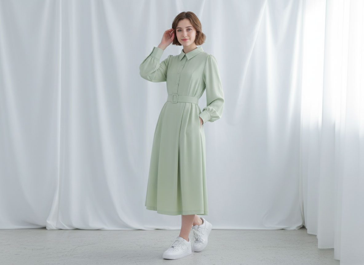 秋冬の街を歩くとき、ワンピースの柔らかな揺れとスニーカーの軽やかさが重なり、自然体のまま上品さを纏える季節になります。