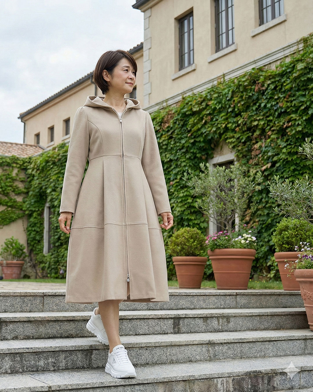 一歩進むたび揺れるシルエットが美しく、秋冬の街並みにしっくり馴染みます。