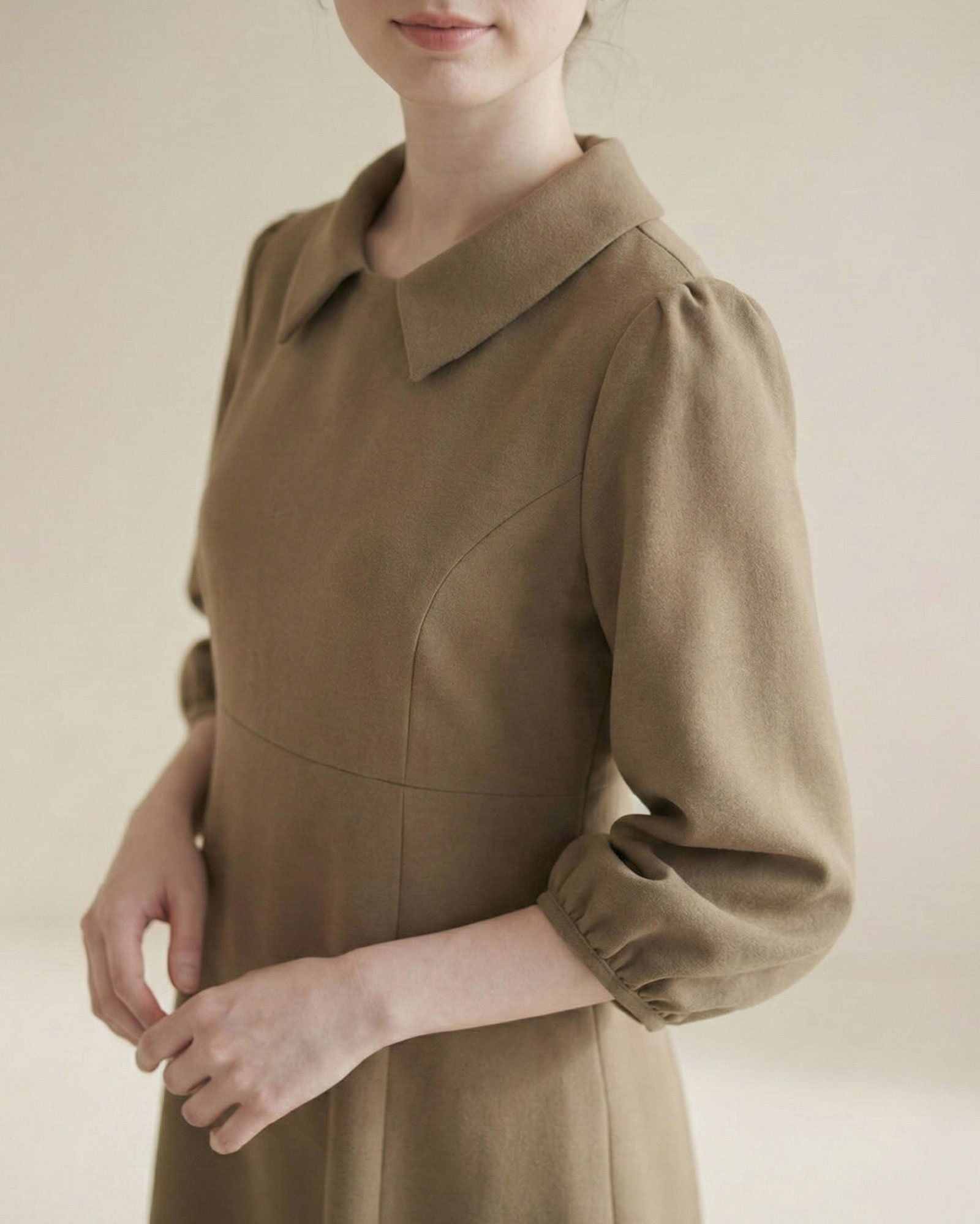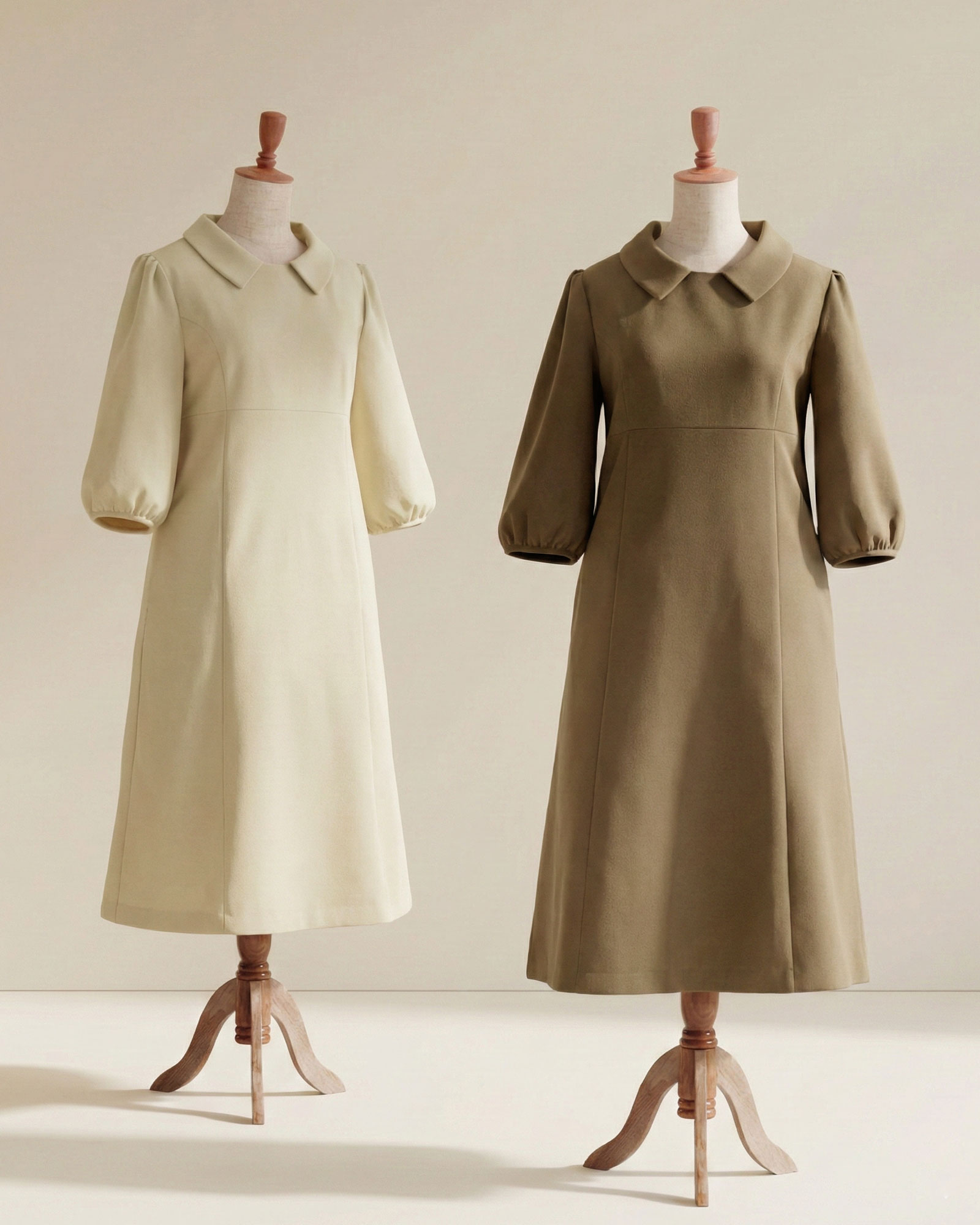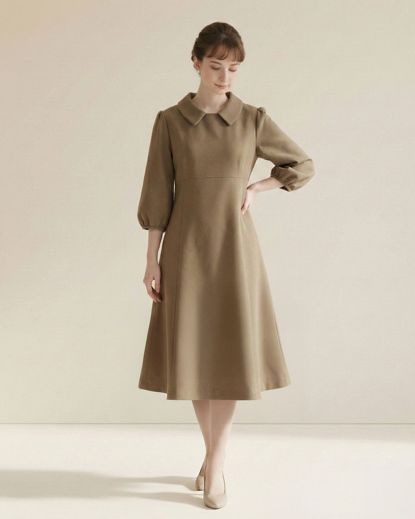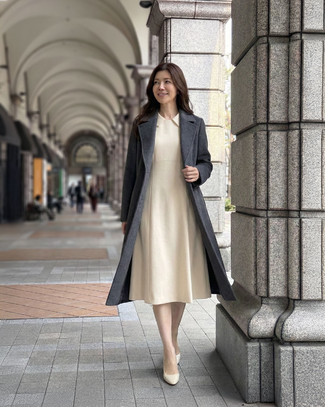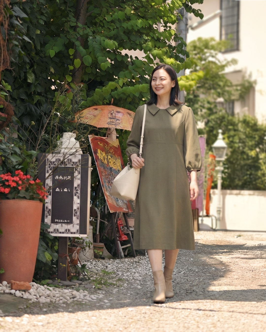 派手ではないけれど、上品な襟元とぽわん袖、膝を隠すミモレ丈が、そっと大人の落ち着きを生み出し、そのすべてが、冬の毎日に「柔らかな余白」を添えてくれます。