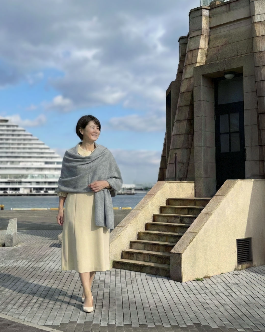 軽やかなカシミアストールを添えるだけで、仕上がりに品が溢れます。
