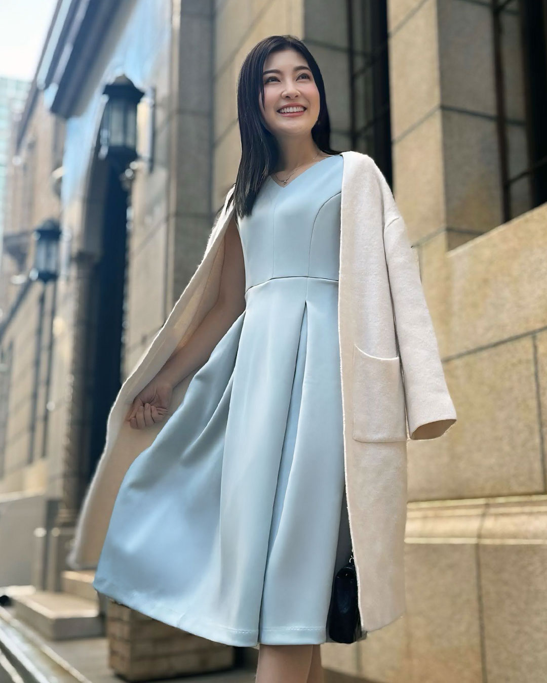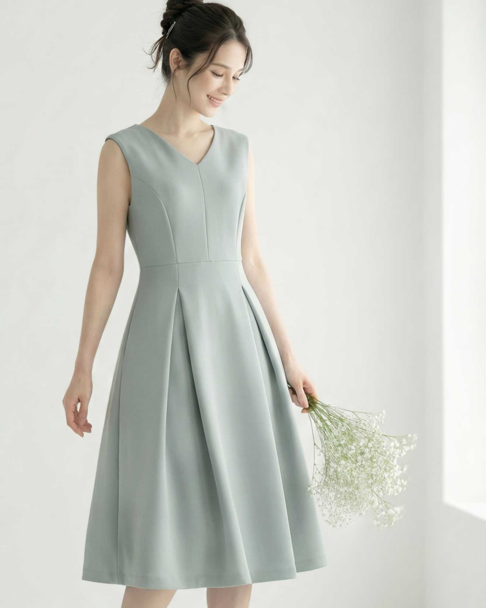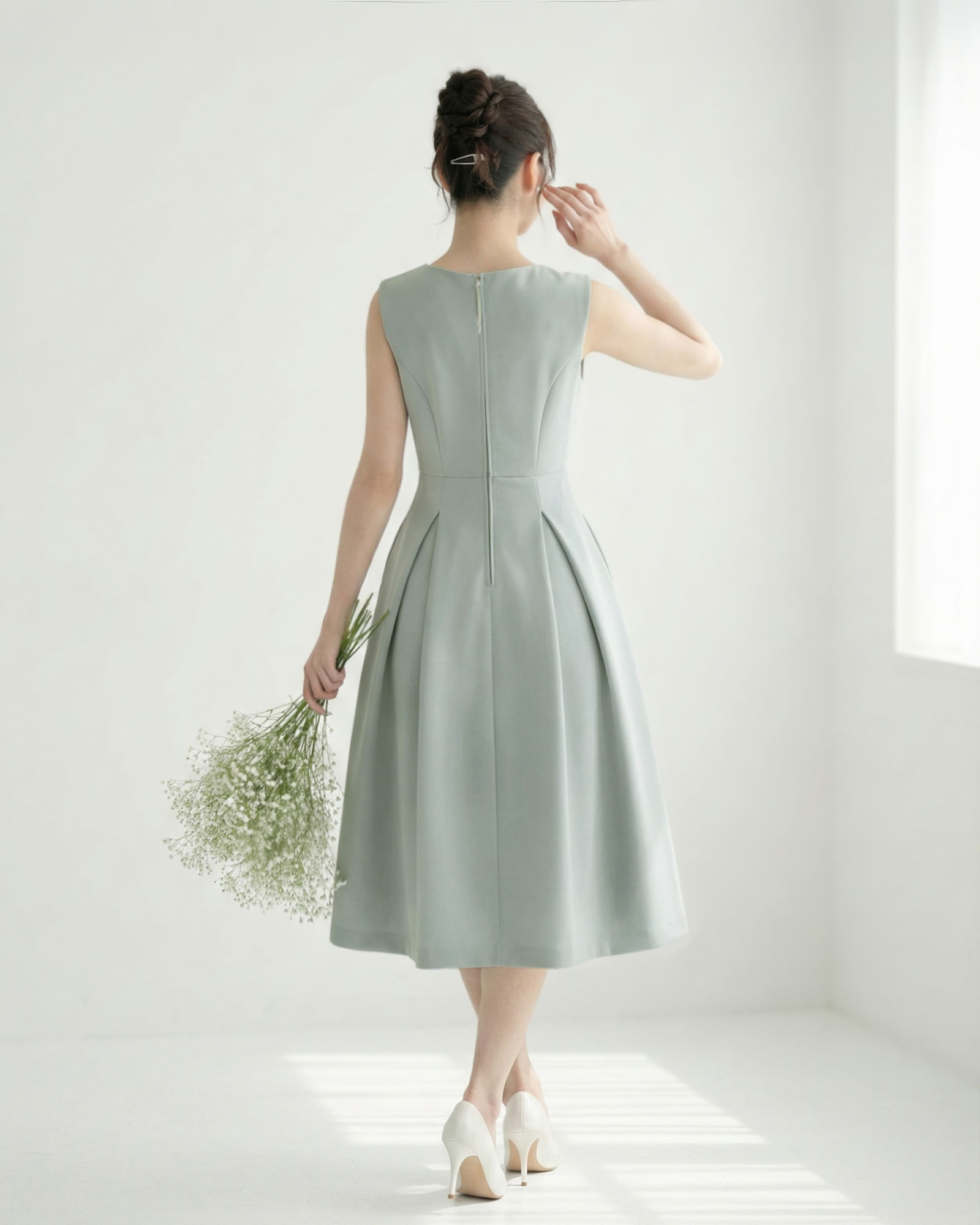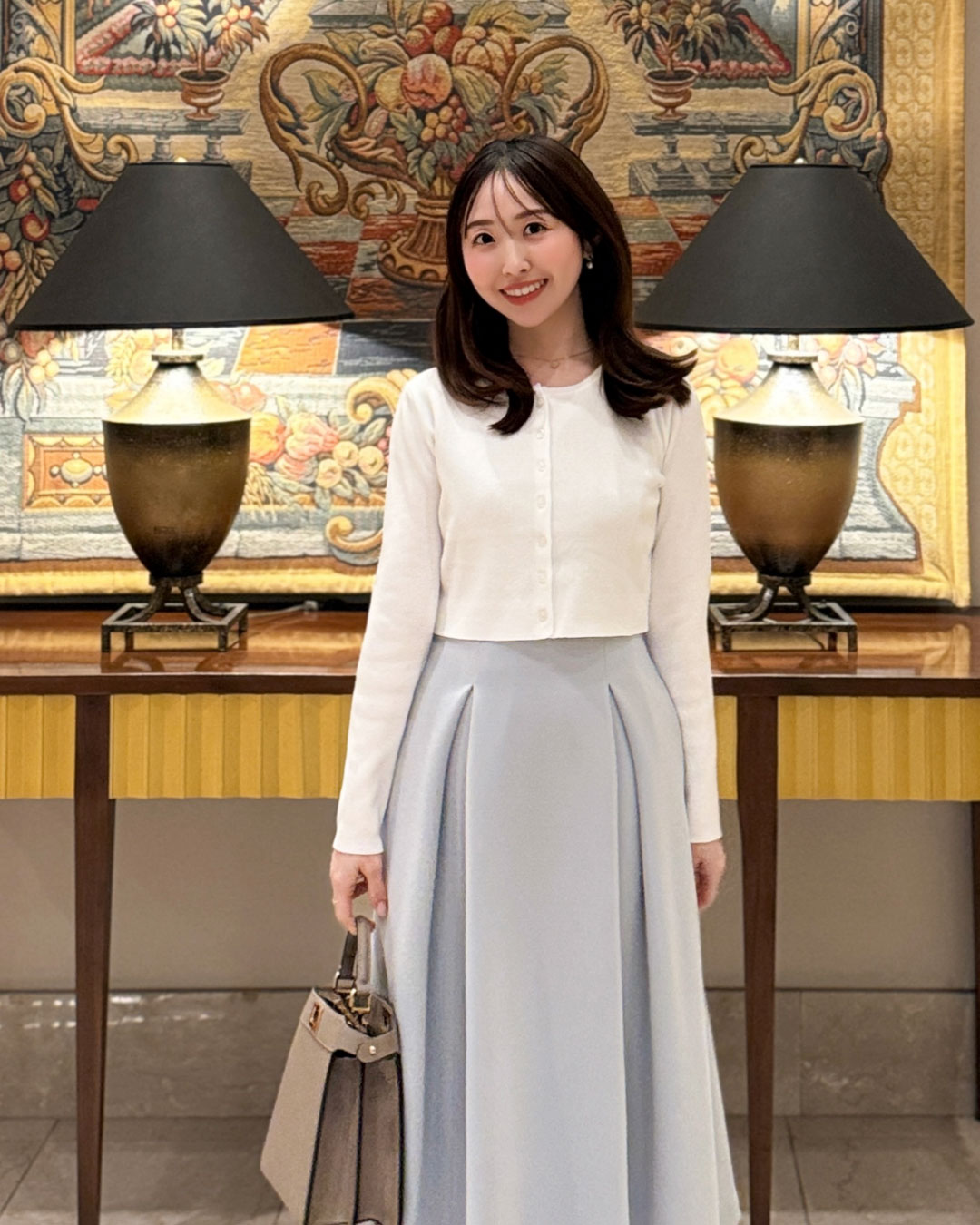 腰回りやヒップラインを拾いすぎず、ふわっと広がるフレアが美しい。