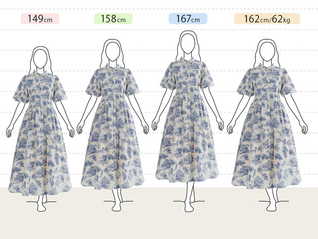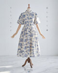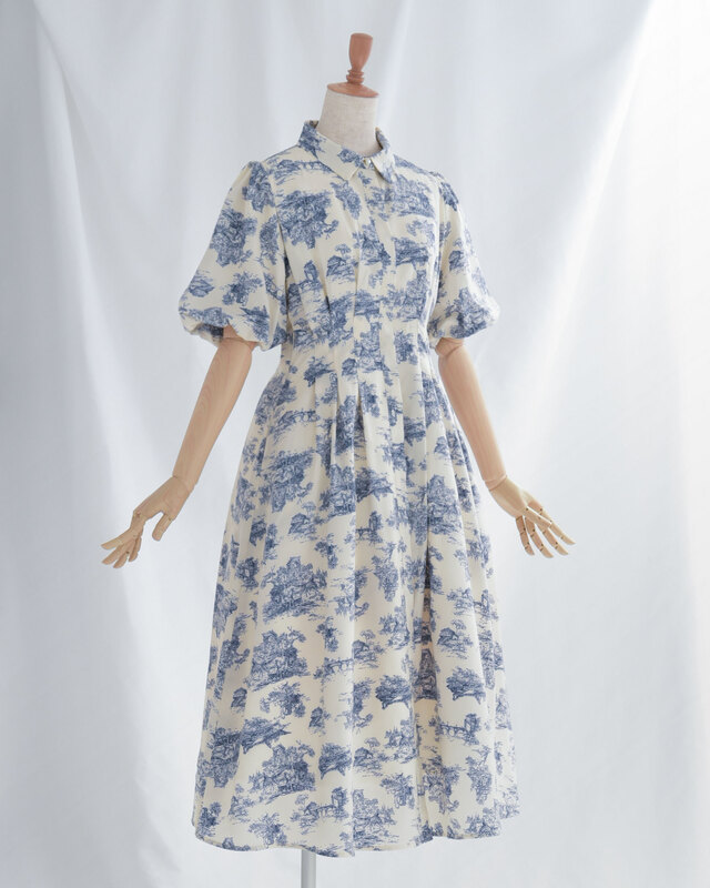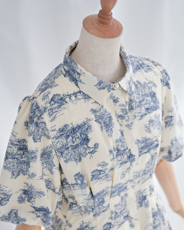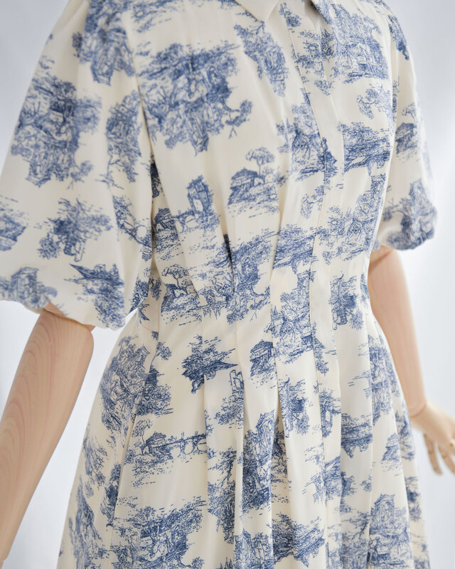膨らんだ袖や、スカートのすその裏地がない部分が少し透けているところなど、デザインが素敵です。さわやかな印象のブルーの模様もとてもきれいです。襟がついていて袖も長めなので、ホテルのレストランなど、服装に気を遣うところでも、上着なしで着ていけて助かります。