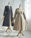 年齢を重ねるほど、きれいめな装いほど、どこか“頑張って見える”瞬間が増えてくる。 そんな違和感を感じる日も、このワンピースなら自然に気持ちが整います。 バイカラーが描く縦のラインは、ワンピース専門店ならではの計算。 視線を中央に集めることで、全身をすっきりと見せながら、清楚で上品な印象を引き出します。 フォーマルな場にも映えながら、日常にもなじむきれいめ感。 装うシーンを選ばない安心感があります。 丈感は、佇まいを美しく見せる上品なミモレ丈。 歩くたびに揺れるフレアシルエットが、所作まで穏やかに整えてくれます。 長さに迷いがちな私たちにとって、この安心感は何より大切。 何度も試着を重ねて導き出したバランスです。 袖は、露出を抑えた八分丈。 肩から腕をやさしく包み込み、手首をきゅっと美しく見せます。 さりげないスリットが動きを妨げず、きれいめでありながら実用性も忘れません。 素材には、上質な起毛ツイルを使用。 表面はすっきりと清楚な印象のまま、着るとほんのり暖かい。 空気を含んだような肌あたりが心地よく、長時間の着用でも快適です。 無理をしなくても、自然と整って見える。 今の私たちにちょうどいい一着です。