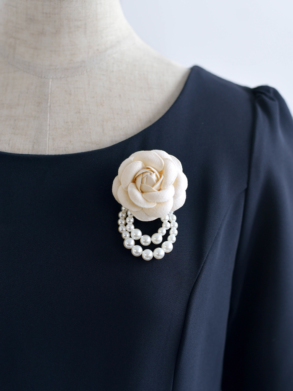 華やかで立体的、なのに温かみのある素材感のローズカメリアだから、「人目を引くのに目立ちすぎず」あらゆるフォーマルシーンに対応します。