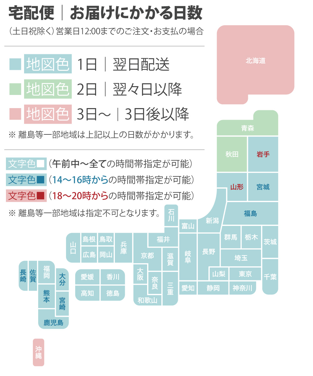 ※ただし時間を指定された場合でも、事情により指定時間内に配達ができない事もございます。